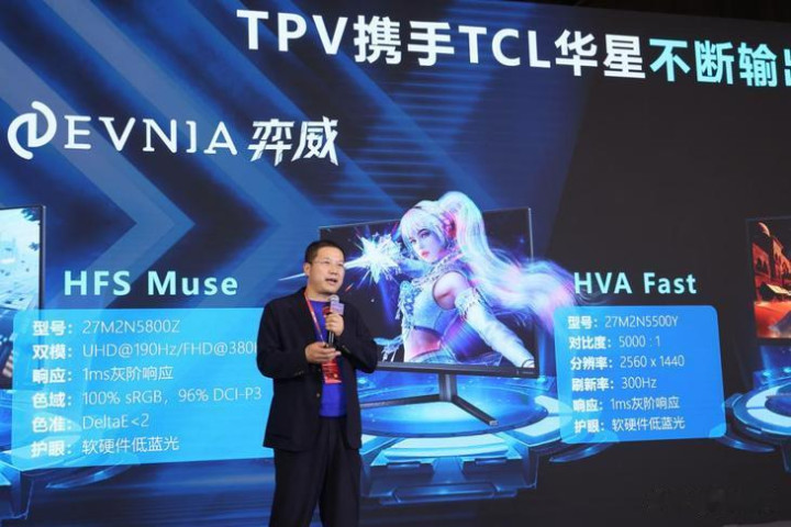 此次会上,EVNIA 弈威即重磅发布全球首款双模1000Hz电竞显示器新品27M2N5500XD。该产品以QHD@500Hz / HD@1000Hz双模显示为核心,真千帧超高刷新率,打破常规,匹配未来显卡与芯片的澎湃性能,使画面如丝绸般顺滑流转,顺畅不掉帧。加之搭载TCL华星HFS Shoot技术,通过光配向工艺同时实现高分辨率+高刷新率+高画质的“三高”优势,全面覆盖FPS游戏各类型玩家的需求,达成唯美画质与流畅竞技的双重满足!目前新品即将面世,敬请期待!