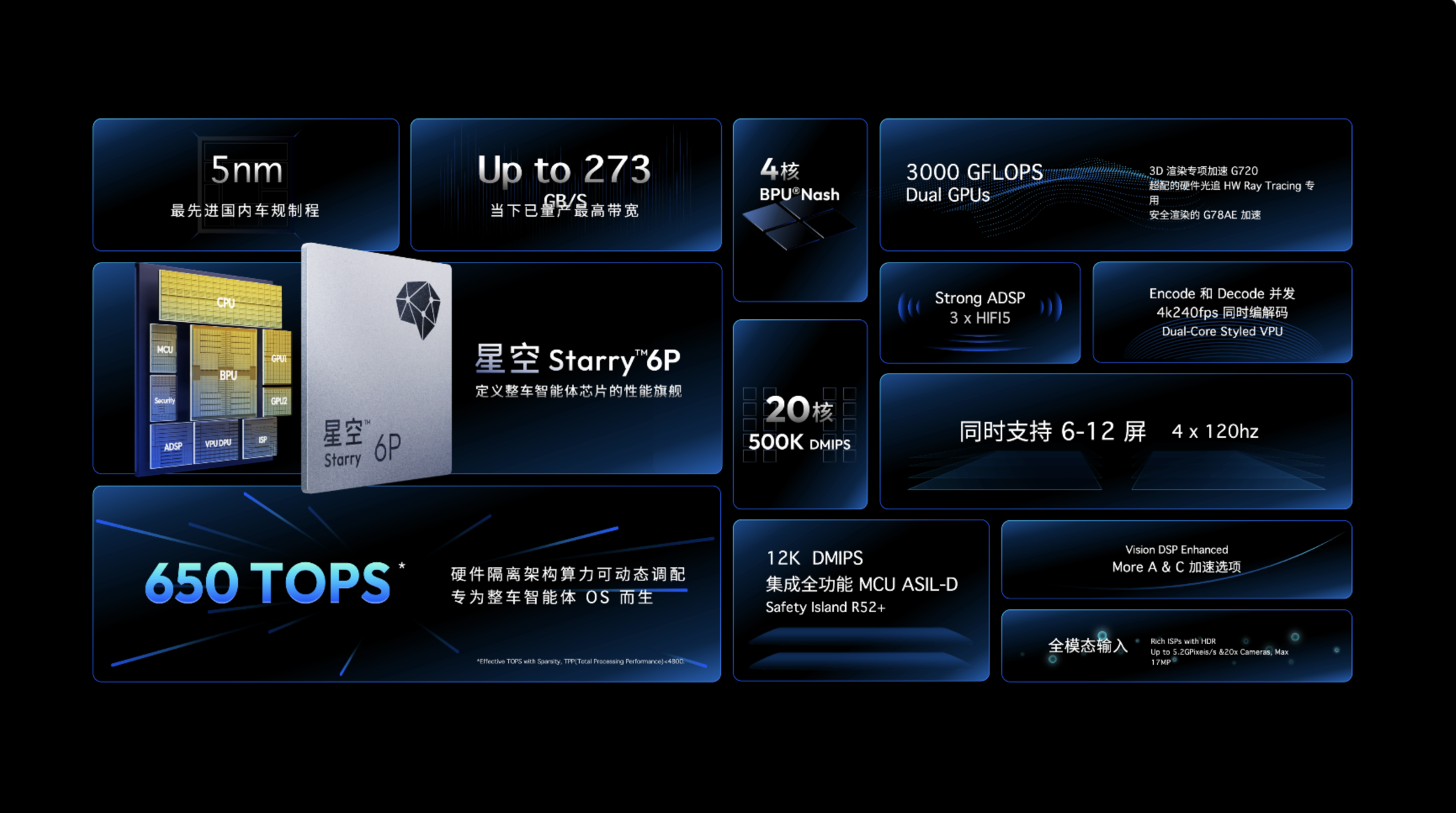 它的参数当然也很凶:星空Starry™6P有5nm工艺,650TOPS BPU算力,273GB/S内存带宽,目标在2026年三季度实现全球首发量产;更重要的是,它把传统双芯片方案改成单SoC方案,单车综合降本1500到4000元,研发交付周期从18个月压缩到8个月。